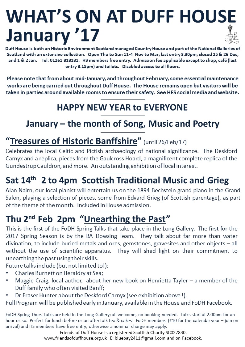 What’s On at Duff House – January 2017 By Ian Williams 30th December 2016 Uncategorized No Comments HAPPY NEW YEAR TO ALL ← A Very Victorian Christmas – Sat 3rd Dec SPRING TALKS PROGRAM DUFF HOUSE → Leave a Reply Cancel replyYou must be logged in to post a comment.
